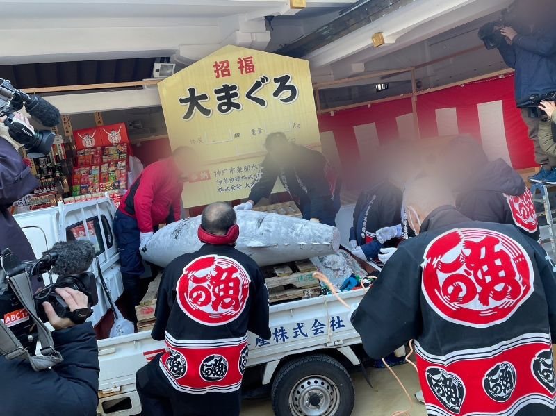 「えべっさん」や「福男選び」で全国的にも有名な兵庫県の西宮神社では、1月9日より開催される十日戎にあわせ、前日に「招福大まぐろ奉納式」が行われました。この奉納式には、東部水産物卸売協同組合と神港魚類東部支社、当社神戸東部支社が毎年まぐろ1匹と鯛2匹を奉納しています。