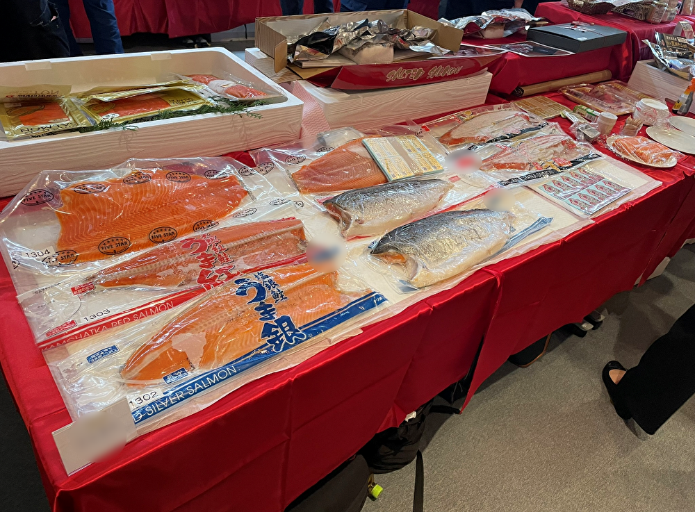 当日は、年末商材で扱われるサーモンやカニ、エビなどの水産品が多く展示されました。これらの商品は、おせちや鍋物など様々な料理に使用されます。また当社キッチンチームやメーカー様が作られた商品の試食コーナーを設けることで、多くの方に商品の良さをアピールできる工夫を施しました。