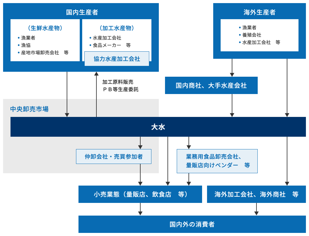 大水の事業は、産地から消費者まで水産物が流通する仕組みの中で、集荷・販売・提案などの役割を担っています。